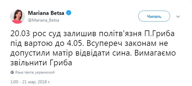 "20.03 российский суд оставил политзаключенного П. Гриба под стражей до 4.05. Вопреки законам не допустили мать навестить сына. Требуем освободить Гриба", - написала спикер дипломатического ведомства.