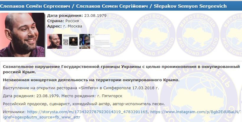 "Сознательное нарушение государственной границы Украины с целью проникновения в оккупированный Россией Крым. Незаконная концертная деятельность на территории оккупированного Крыма", - говорится в описании к Слепакову.