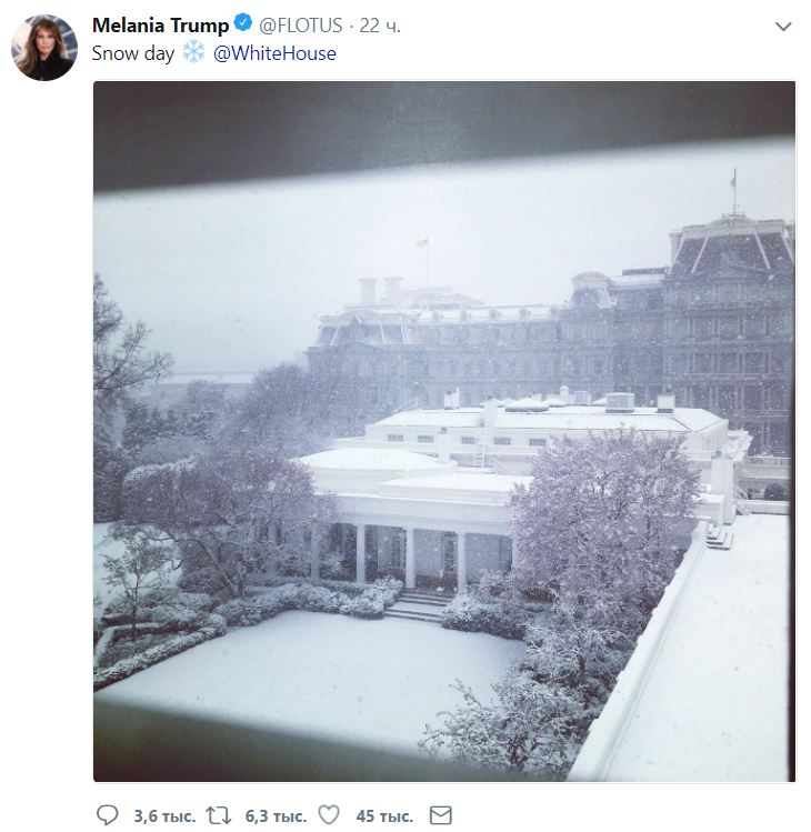 А вчера Мелания разместила в Twitter грустное фото заснеженного Белого дома.
