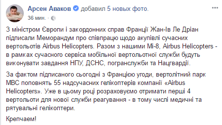 "С министром МИД Франции Ле Дрианом подписали соглашение о закупке 55 современных вертолетов Airbus Helicopters. Вместе с нашими Mи-8, Airbus Helicopters – в рамках современного сервиса мобильной вертолетной службы будут выполнять задачи Нацполиции, ГСЧС, погранслужбы и Нацгвардии", - написал Аваков на своей странице в Facebook в пятницу.