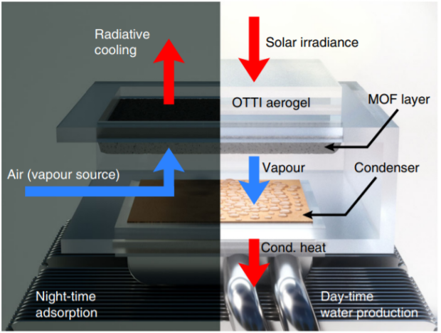 Поглотитель влаги устроен достаточно просто и в нем нет ни одной механической части. Он представляет собой камеру, в верхней части которого расположена адсорбирующая пластина. Это высокопористый лист меди, на внутренние структуры которой осажден металл-органический каркас MOF-801. Исследователи выбрали это соединение из-за его высокой способности к поглощению воды. Верхняя часть этой пористой пластины покрашена в черный цвет для максимально эффективного нагревания солнечными лучами. Для того, чтобы это тепло не рассеивалось, она накрыта слоем прозрачного теплоизолирующего аэрогеля, который пропускает солнечные лучи к пластине, но не пропускает тепло от нее. На нижней части камеры установлен конденсатор, тепло от которого отводится тепловыми трубками.