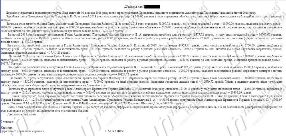 "Заработная плата Президента Украины Порошенко П. А. за февраль 2018 года начислена в размере 28 000 гривен", - сказано в нем.