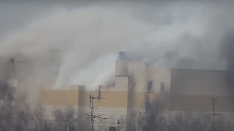 Площадь пожара в торговом центре "Зимняя вишня" составила 1 500 квадратных метров. Над городом поднимаются гигантские клубы черного дыма.