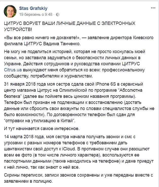 Пока на Западе критикуют Facebook за утечку персональных данных, в Украине возник свой локальный скандал на эту тему. Компанию "Цитрус" обвинили в продаже информации о клиентах в руки вымогателей.