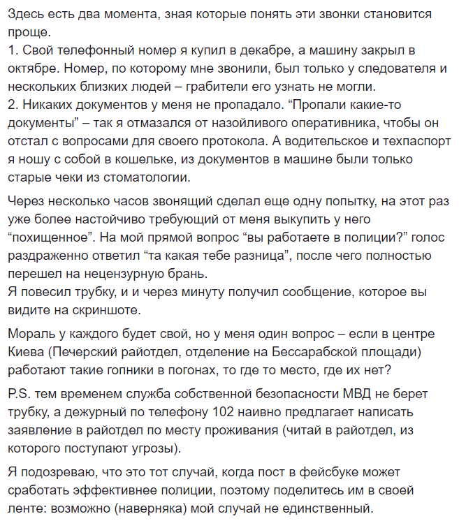 "Через несколько часов звонящий сделал еще одну попытку, на этот раз уже более настойчиво требующий от меня выкупить у него "похищенное". На мой прямой вопрос "вы работаете в полиции?" голос раздраженно ответил "та какая тебе разница", после чего полностью перешел на нецензурную брань.