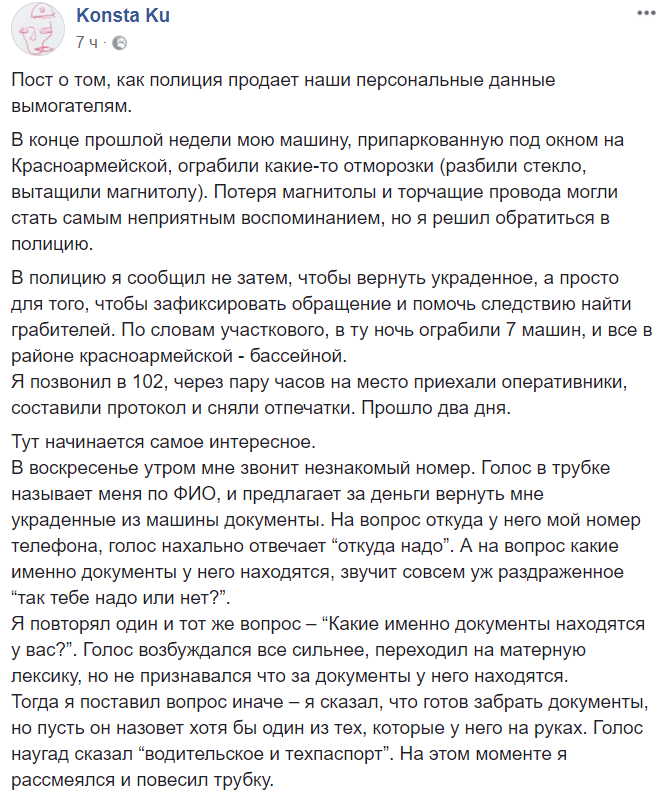 Пользователь из Киева Konsta Ku рассказал, как у него ограбили автомобиль. Он вызвал полицию, где оставил свой номер телефона. Через некоторое время ему начали звонить неизвестные и предлагать выкупить за деньги документы, которые якобы находились в этой машине.