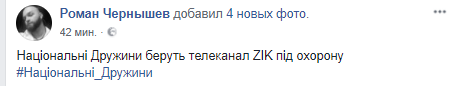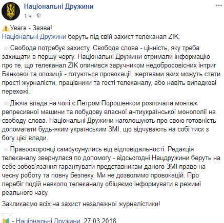 В заявлении Нацкорпуса говорится, что Нацдружина получили информацию о том, что телеканал ZIK оказался заложником недобросовестных интриг Банковой и оппозиции, что готовятся провокации, жертвами которых могут стать журналисты, работники и гости телеканала, случайные прохожие.