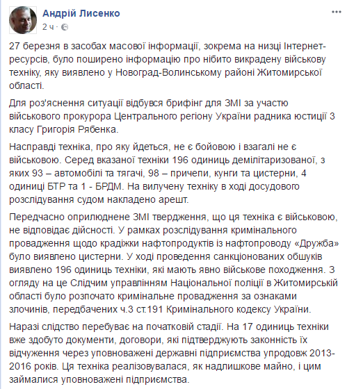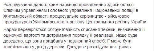 "Информации о том, что отдельные единицы техники завезены из зоны АТО, также нет... Досудебное расследование продолжается", - подчеркнул  Рябенко.