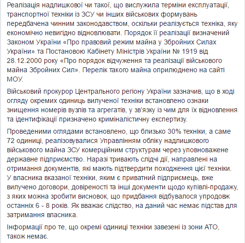 "Установлено, что около 30% техники, а именно 72 единицы, реализовывались Управлением учета избыточного военного имущества ВСУ коммерческим структурам через уполномоченное государственное предприятие. Сейчас продолжаются следственные действия, направленные на получение документов, которые должны подтвердить происхождение этой техники", - отметил он.