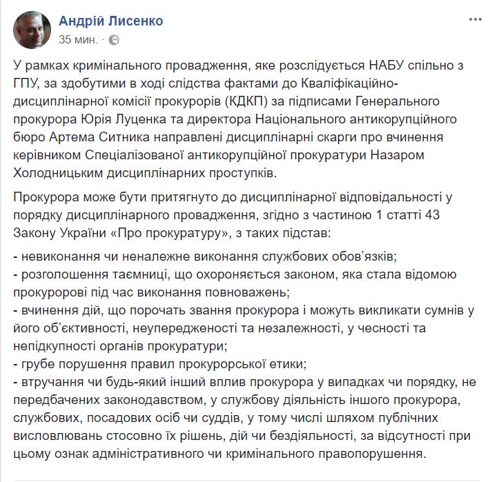 Дисциплинарные жалобы на Холодницкого с подписями Луценко и Сытника были направлены в КДКП в рамках уголовного производства, которое расследуется НАБУ совместно с Генпрокуратурой по добытыми в ходе следствия фактам.