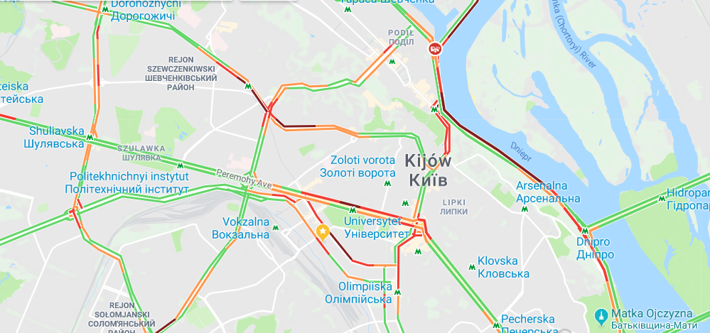 Так, движение затруднено в центральной части Киева, особенно в районе станций метро "Дружбы народов", "Лыбидская", "Дворец Украина", "Олимпийская", "Университет", "Театральная", "Золотые ворота", "Кловская", "Майдан Незалежности", "Крещатик", "Контрактовая площадь", "Почтовая площадь" и другие.