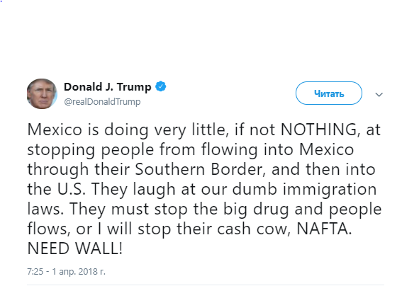 Президент США Дональд Трамп призвал власти Мексики принять меры, чтобы остановить поток наркотиков и нелегальных мигрантов в США. В противном случае Соглашение о североамериканской зоне свободной торговли (NAFTA) будет расторгнуто. Об этом Дональд Трамп написал в своем микроблоге в Twitter.