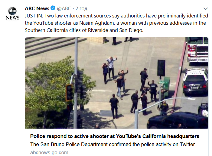 "Два источника в правоохранительных органах заявили, что предварительно установлена личность стрелявшей в офисе Youtube - это женщина Насим Агхдам, ранее проживавшая в Южной Калифорнии в городах Риверсайд и Сан-Диего", - передает телеканал ABC в Twitter.