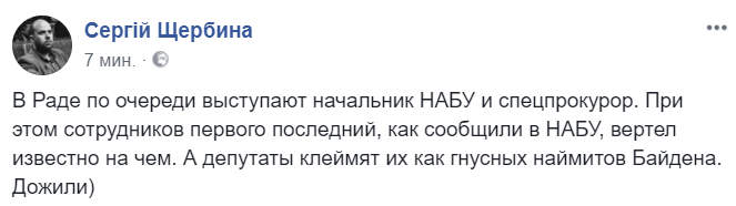 14:10  "В Раде по очереди выступают начальник НАБУ и спецпрокурор. При этом сотрудников первого последний, как сообщили в НАБУ, вертел известно на чем. А депутаты клеймят их как гнусных наймитов Байдена. Дожили", - пишет в Facebook журналист Сергей Щербина.