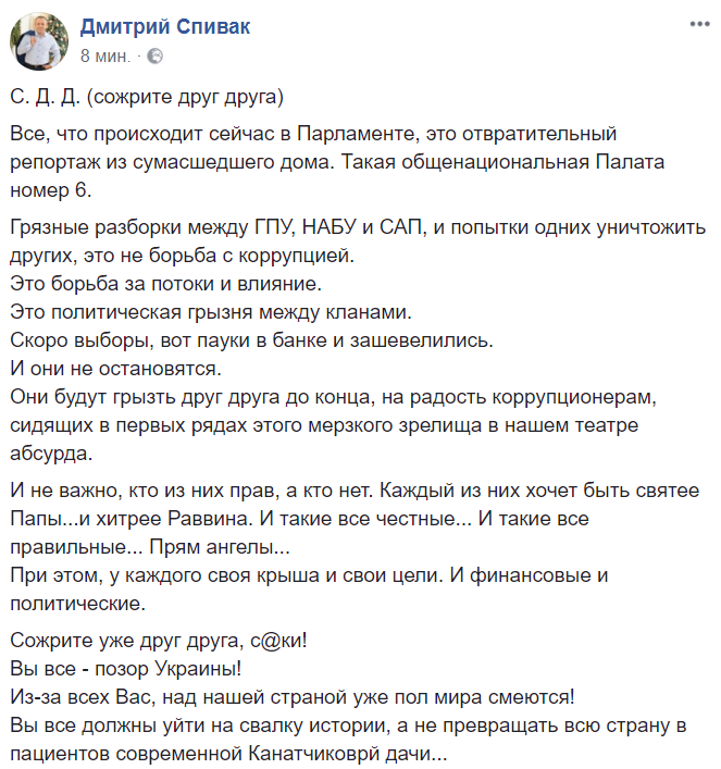 Скоро выборы, вот пауки в банке и зашевелились. И они не остановятся. Они будут грызть друг друга до конца, на радость коррупционерам, сидящих в первых рядах этого мерзкого зрелища в нашем театре абсурда".