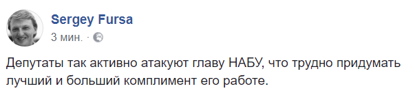 13:43  "Депутаты так активно атакуют главу НАБУ, что трудно придумать лучший и больший комплимент его работе", - пишет в Facebook инвестбанкир Сергей Фурса.