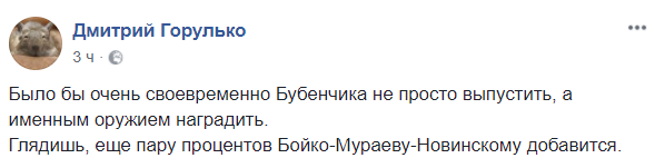 "Было бы очень своевременно Бубенчика не просто выпустить, а именным оружием наградить. Глядишь, еще пару процентов Бойко-Мураеву-Новинскому добавится".
