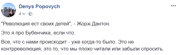 Глава института Нацпамяти Владимир Вятрович также считает, что результат "дела Бубенчика" может вернуть Украину в прошлое. Попутно в своем посте Вятрович прямо утверждает, что майдановец убил несколько милиционеров. Но предлагает списать это на "революционную необходимость".