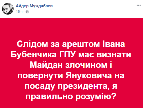 "Вслед за арестом Ивана Бубенчика ГПУ признает Майдан преступлением и вернет Януковича на пост президента, я правильно понимаю?"