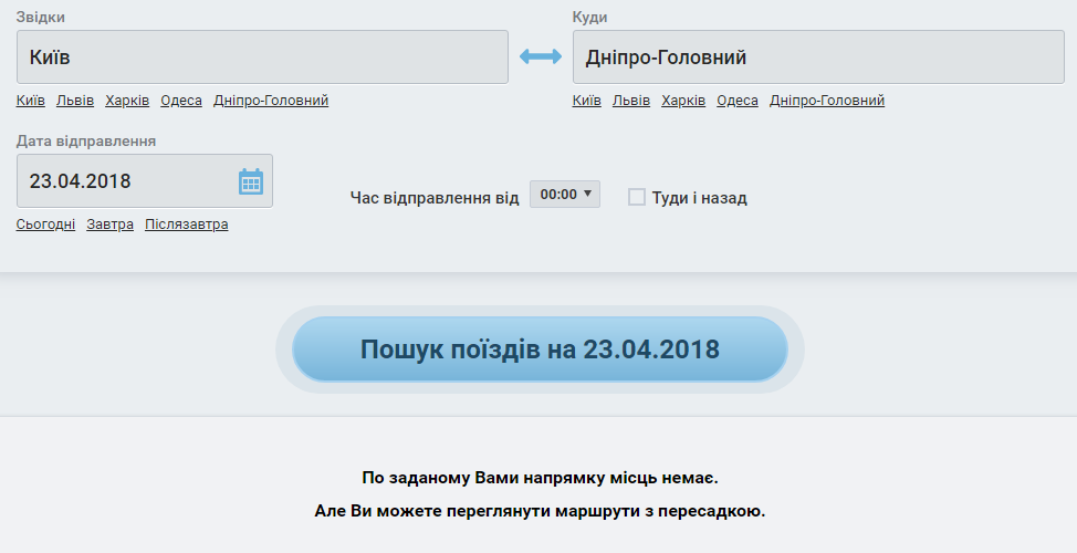 Как оказалось, на сайте бронирования билетов "Укрзализныци" действительно нельзя купить билеты из столицы в Днепр, Херсон, Запорожье и Николаев с 23 апреля – система сообщает, что поезда отсутствуют.