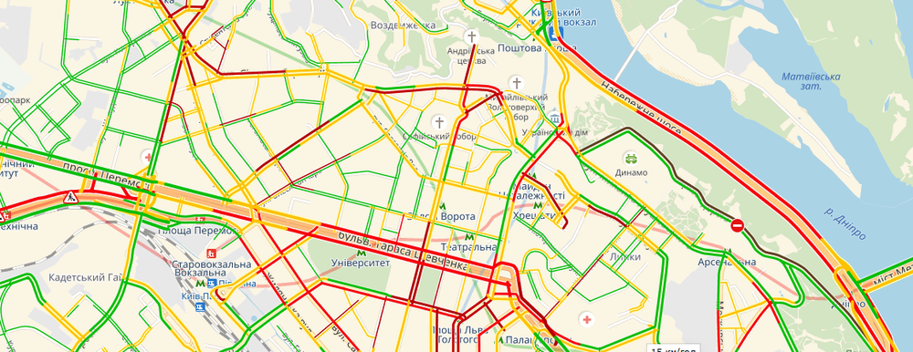 Нарастает пробка по проспекту Победы, все сложнее передвигаться по Подолу.
