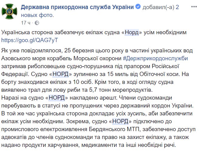 Судно "Норд" остановили в 15 милях от Обиточной косы (расположенной 50 км от Бердянска). В ходе проверки установлено, что оно зарегистрировано в Крыму. Кроме этого, считают в Госпогранслужбе, члены команды нарушили порядок выезда с временно оккупированной территории Украины. Все они имели паспорта граждан РФ, выданные в Керчи.