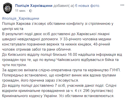 "Сейчас два человека доставлены в 4-ю больницу. Возможных участников данного происшествия количеством семь человек доставили в Киевское отделение полиции. Сейчас открыто уголовное производство по ч.4 ст.296 "хулиганство". Устанавливаются факты, из-за чего произошел конфликт и с какого - огнестрельного или травматического стреляли", - отметил Коцар.