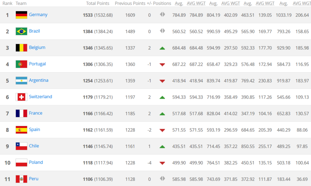 На первом месте нового рейтинга ФИФА действующий чемпион мира - сборная Германии. Но в первой десятке не обошлось без изменений. Бельгия совершила рывок с пятой ступеньки на третью, оставив позади Португалию и саму Аргентину.