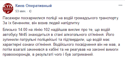 12 апреля в Киеве задержали водителя общественного транспорта, который находился на работе в состоянии алкогольного опьянения. Об этом сообщил "Киев Оперативный" в Facebook.