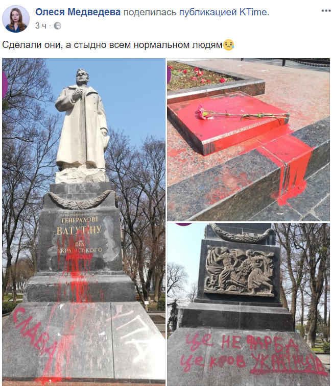 В Киеве националисты открыто осквернили памятник Николаю Ватутину – генералу, который освобождал Киев от нацистов. Они пришли к нему, чтобы сорвать возложение цветов, которое приурочено к очередной годовщине смерти Ватутина. Он погиб 15 апреля 1944 года после ранения в Ровенской области от пули диверсионной группы УПА.