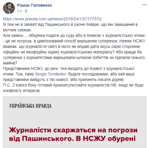 В тоже время, медиаюрист Роман Головченко на своей странице в Facebook высказал мнение о том, что угрозы со стороны Пашинского подать в суд и обратиться в Комиссию по журналистской этике можно считать не запугиванием журналистов, а цивилизованным способом решения споров.