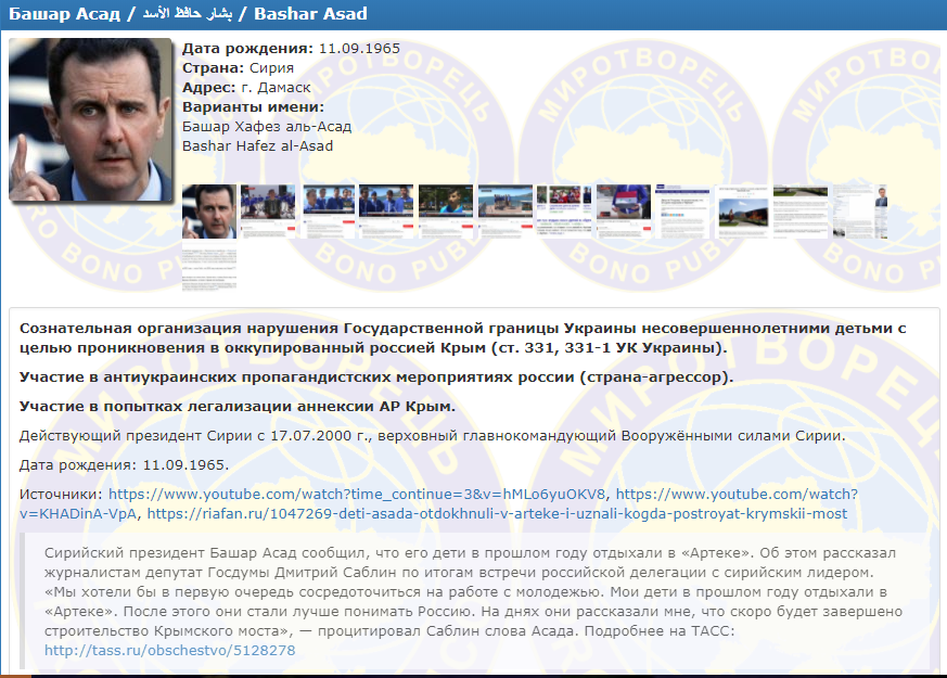 Скандально известный украинский сайт "Миротворец" внес в свои списки президента Сирии Башара Асада после того, как сирийский лидер появился в компании российских артистов и деятелей культуры, а его дети отдохнули в аннексированном Крыму.