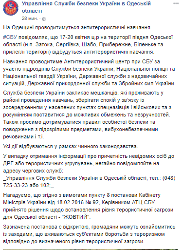 Служба безопасности Украины проведет антитеррористические учения на юге Одесской области (населенные пункты Затока, Сергеевка, Шабо, Прибрежное, Беленькое и прилегающие территории). Мероприятия запланированы на 17-20 апреля.