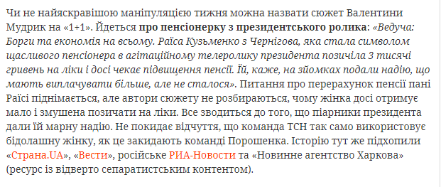 Сюжет телеканала "1+1" про украинскую пенсионерку из агитационного ролика Петра Порошенко назван "Самой яркой манипуляцией недели" согласно еженедельного обзора сайта "Детектор медиа".