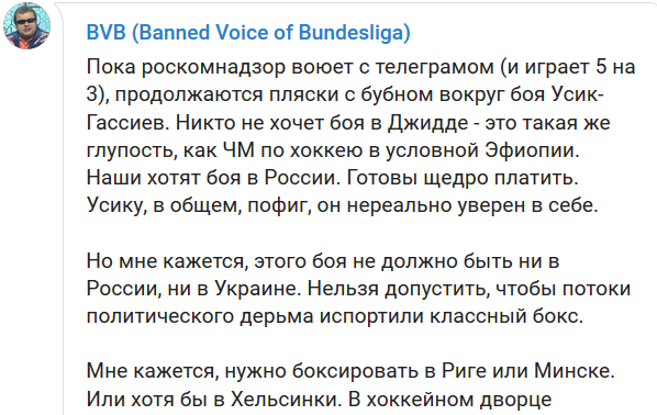 "Пока Роскомнадзор воюет с Телеграммом (и играет 5 на 3), продолжаются пляски с бубном вокруг боя Усик - Гассиев. Никто не хочет боя в Джидде - это такая же глупость, как ЧМ по хоккею в условной Эфиопии.