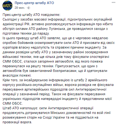 По данным разведки штаба АТО, в указанном районе еще несколько дней назад наблюдатели ОБСЕ фиксировали возгорание автомобиля, от которого пожар перекинулся на остальную технику.