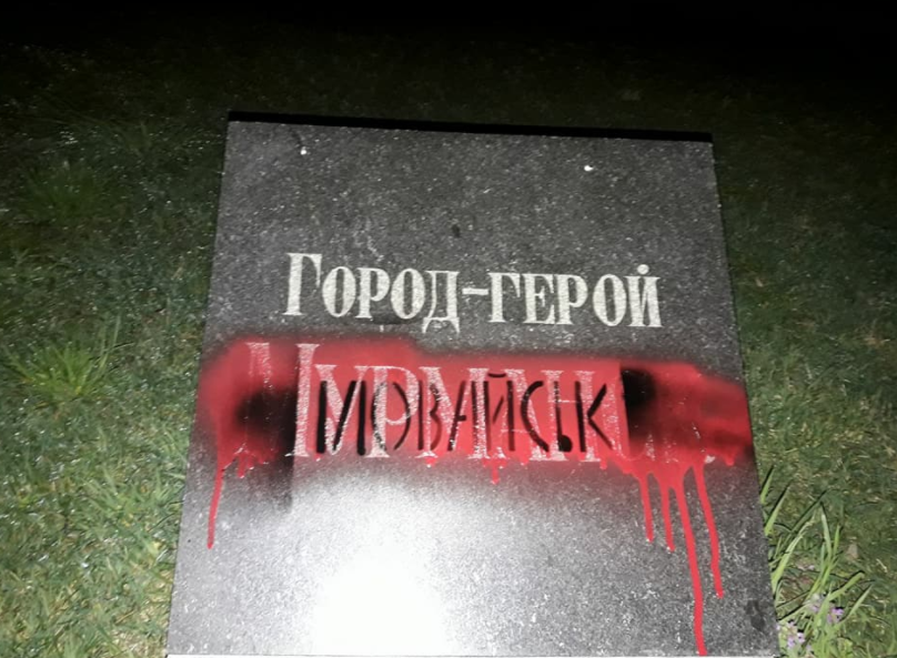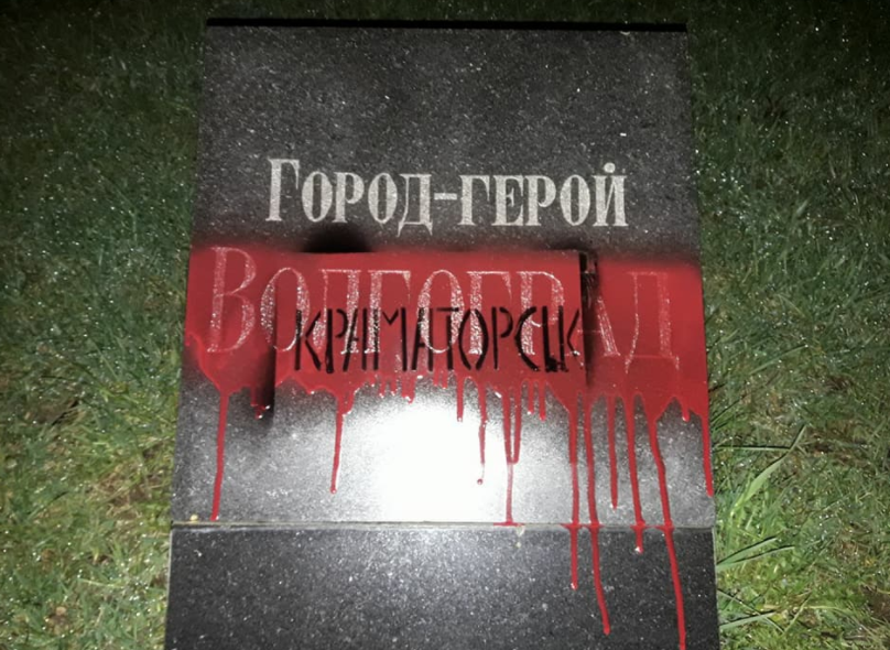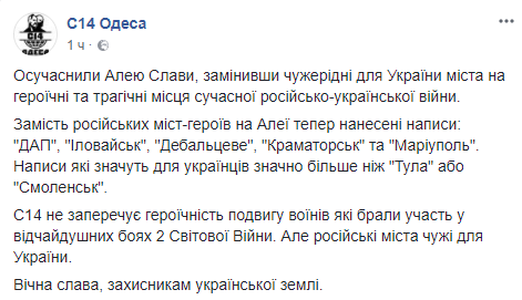 В Одессе на Аллее Славы члены радикальной националистической организации С14 закрасили названия российских городов-героев времен Великой отечественной войны и написали на их месте названия украинских городов в зоне АТО на Донбассе.