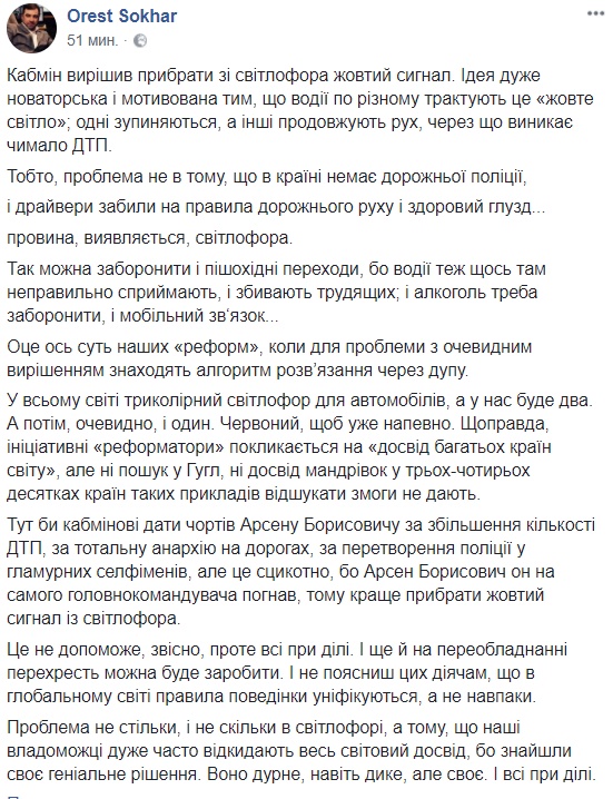 Журналист Орест Сохар считает, что происходящее с аварийностью на дорогах – это фиаско прежде всего реформ Авакова, а не проблема желтого сигнала светофора: