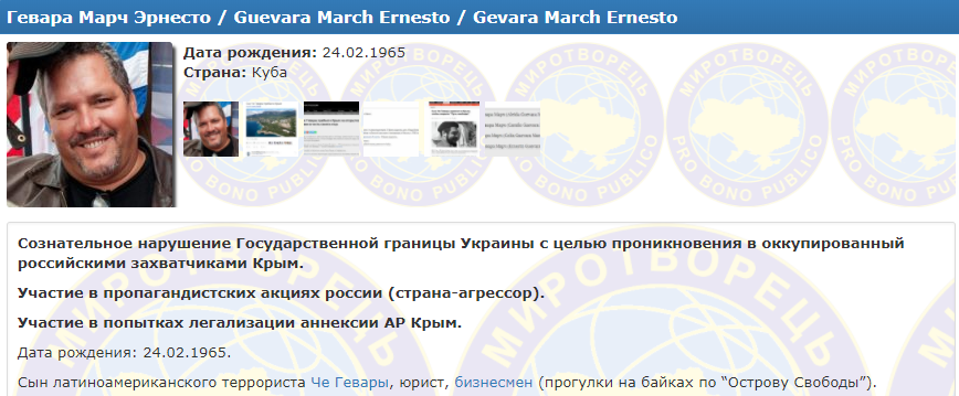В базу раздела "Чистилище" кубинский юрист Марч Эрнесто Гевара был внесен за "сознательное нарушение Государственной границы Украины с целью проникновения в оккупированный российскими захватчиками Крым".