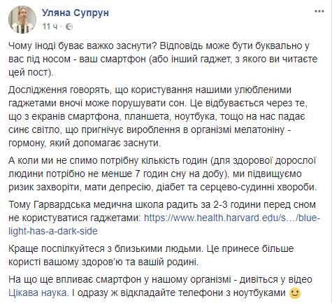 "Поэтому Гарвардская медицинская школа советует за 2-3 часа перед сном не пользоваться гаджетами. Лучше пообщайтесь с близкими людьми. Это принесет больше пользы вашему здоровью и вашей семье", - посоветовала глава Минздрава.