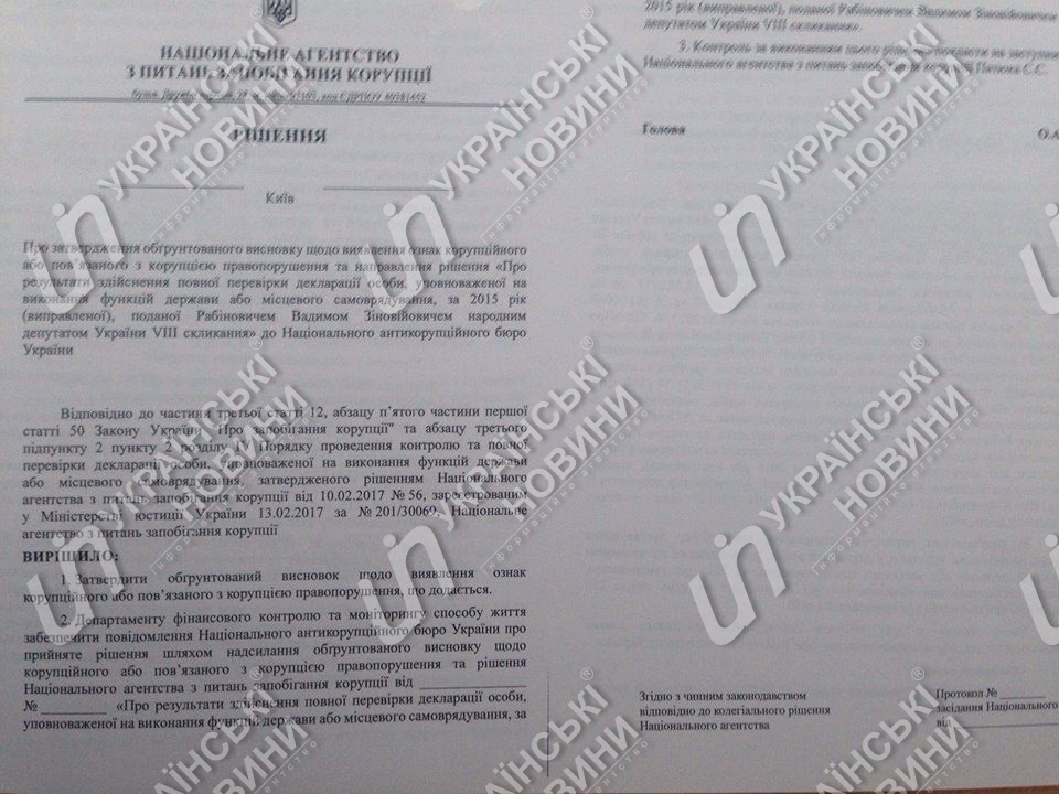 В сообщении НАПК говорится, что в действиях Рабиновича выявлены признаки состава правонарушения, ответственность за которое предусмотрена ст. 366-1 (декларирование недостоверной информации) Уголовного кодекса. Данные о правонарушении НАПК передаст в Национальное антикоррупционное бюро в пятницу.