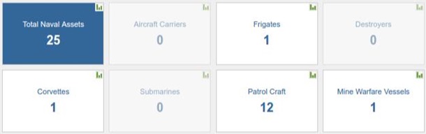 Авианосцев, эсминцев и субмарин у Украины ноль единиц; фрегатов, корветов и тральщиков - по одному. Также есть 12 патрульных катеров.