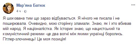 "Я шокирована что сейчас происходит. Я ничего не писала и не распространяла. Очевидно, мою страницу взломали. Знаю, как и кто убивал мой народ. Я националистка. Как историк знаю, что нацистский и коммунистический режимы -это два огня между которыми украинцы боролись. Гитлер-преступник! Это моя позиция!" - написала она.