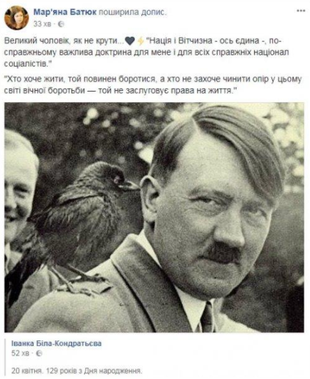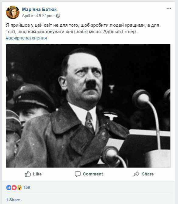 Батюк опубликовала у себя в Facebook "няшную" фотографию фюрера, назвала его "большим человеком, как не крути" и привела две цитаты из "нацистской библии" Mein Kampf ("Моя борьба").