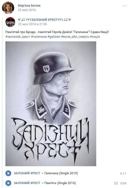 Этот и подобные паблики были у нее в фаворитах. На другом скриншоте Батюк перепостила запись, восславляющую дивизию СС "Галичина", которая комплектовалась в основном из украинцев.