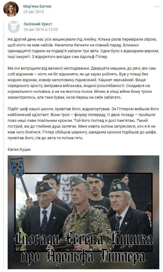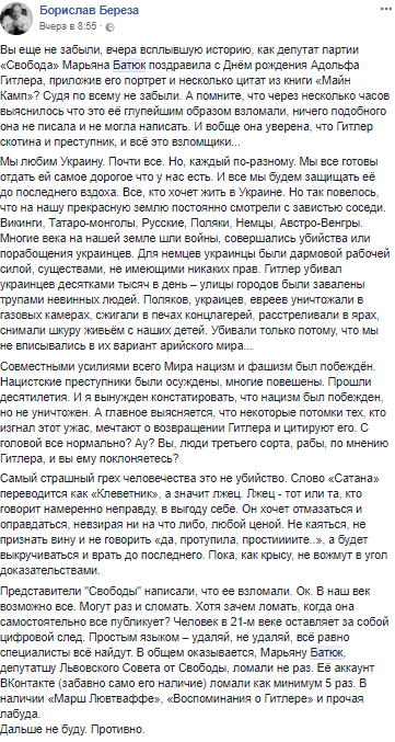 "Представители "Свободы" написали, что ее взломали. Ок. В наш век возможно все. Могут раз и сломать. Хотя зачем ломать, когда она самостоятельно все публикует? Человек в 21-м веке оставляет за собой цифровой след. Простым языком – удаляй, не удаляй, всё равно специалисты всё найдут. В общем оказывается, Марьяну Батюк, депутатшу Львовского совета от Свободы, ломали не раз. Её аккаунт ВКонтакте (забавно само его наличие) ломали как минимум 5 раз. В наличии "Марш Лювтваффе", "Воспоминания о Гитлере" и прочая лабуда".