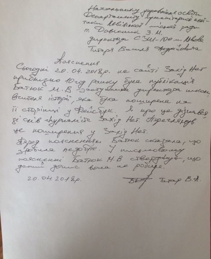 Это подтверждает объяснительная записка директора школы №100 Василия Титара, опубликованная порталом Tvoemisto.tv. "Я об этом узнал со слов журналиста ... Перед объяснительной Батюк сказала, что сделала плохо. В письменном объяснении Батюк М.В. утверждает, что данного сообщения не делала", – пишет директор школы.