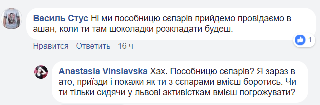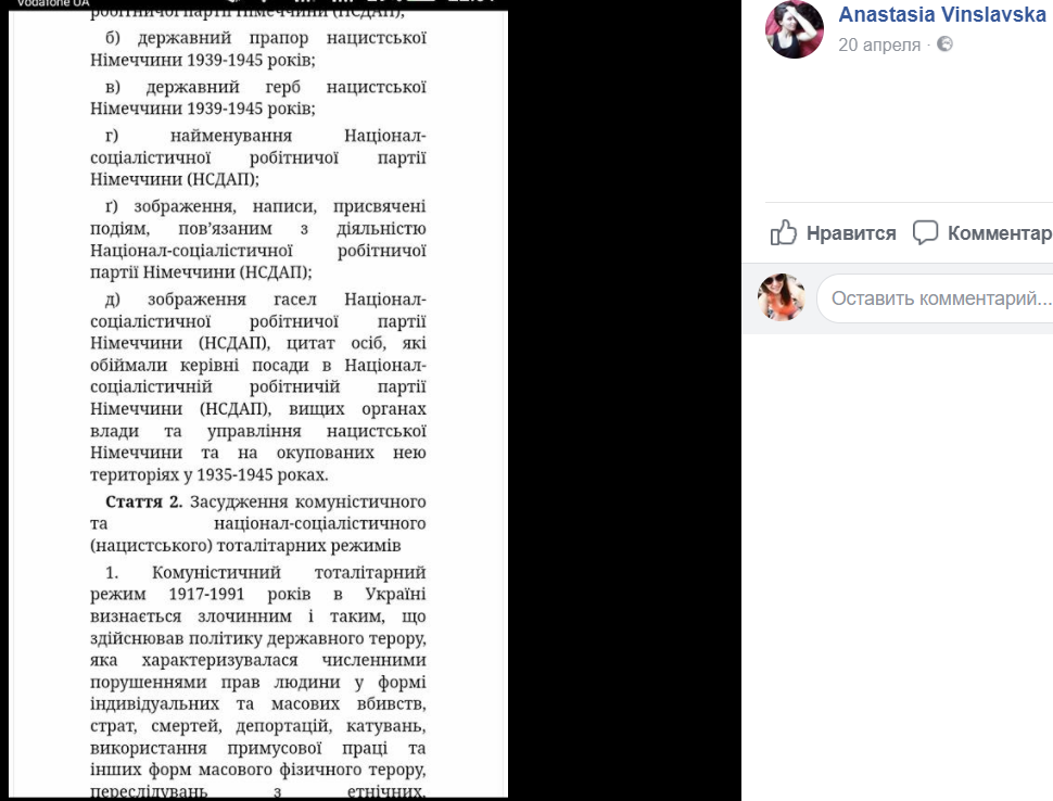 "У меня не было в принципе иллюзий, но теперь убедилась, многие у меня в друзьях поддерживают нацизм и оправдывают Гитлера. Я не знаю, как так, вы, вероятно, историю прогуляли и забыли, сколько украинцев уничтожил этот изверг ... Удалитесь сами, мне биомусора в друзьях не нужно", – пишет в Facebook львовская активистка и волонтер АТО Анастасия Винславская.