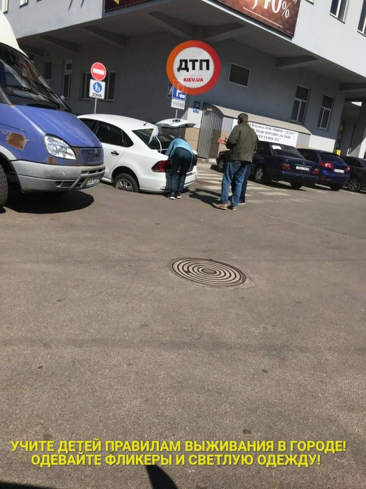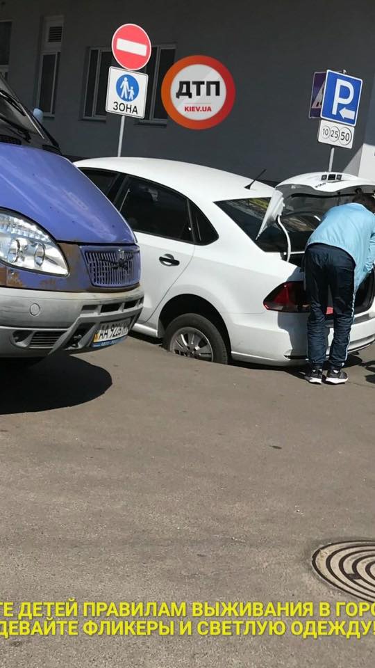 В Киеве на одной из парковок автомобиль белого цвета провалился под асфальт. Об этом сообщает dtp.kiev.ua на своей странице в Facebook.