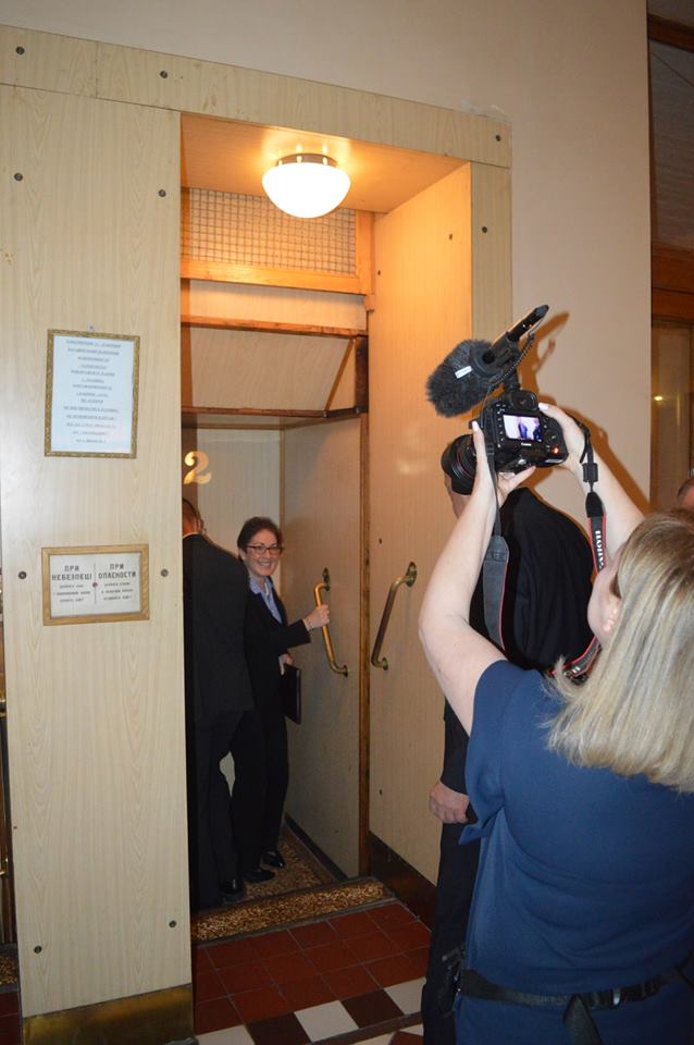 Посол США в Украине Мари Йованович побывала в Ужгороде. После официальной части встречи глава Закарпатской ОГА Геннадий Москаль показал гостье построенное в 1930-е годы здание, в котором в настоящее время разместилась ОГА, и покатал на ретро-лифте.